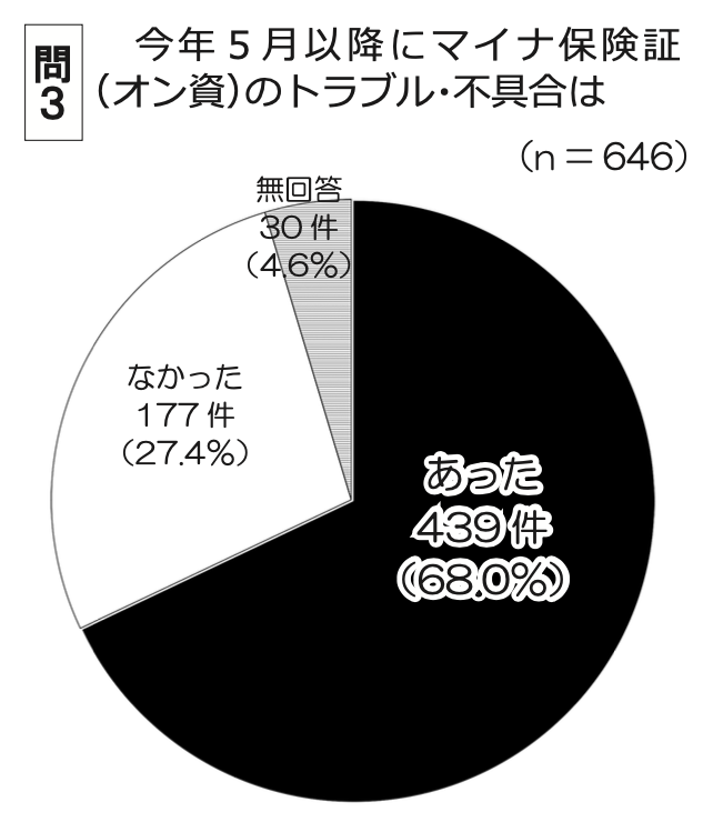 会見冒頭、協会事務局から、調査は8月9日から23日までの期間に届いた646件(回収率16.3%)について、今年5月以降のマイナ保険証(オンライン資格確認システム・以下、オン資)のトラブル・不具合事例、「マイナ保険証利用促進集中取組月間」で患者とのトラブル事例、健康保険証廃止に関する捉え方を調査するため12項目をチェック式、記述式で回答を求めたと紹介した。